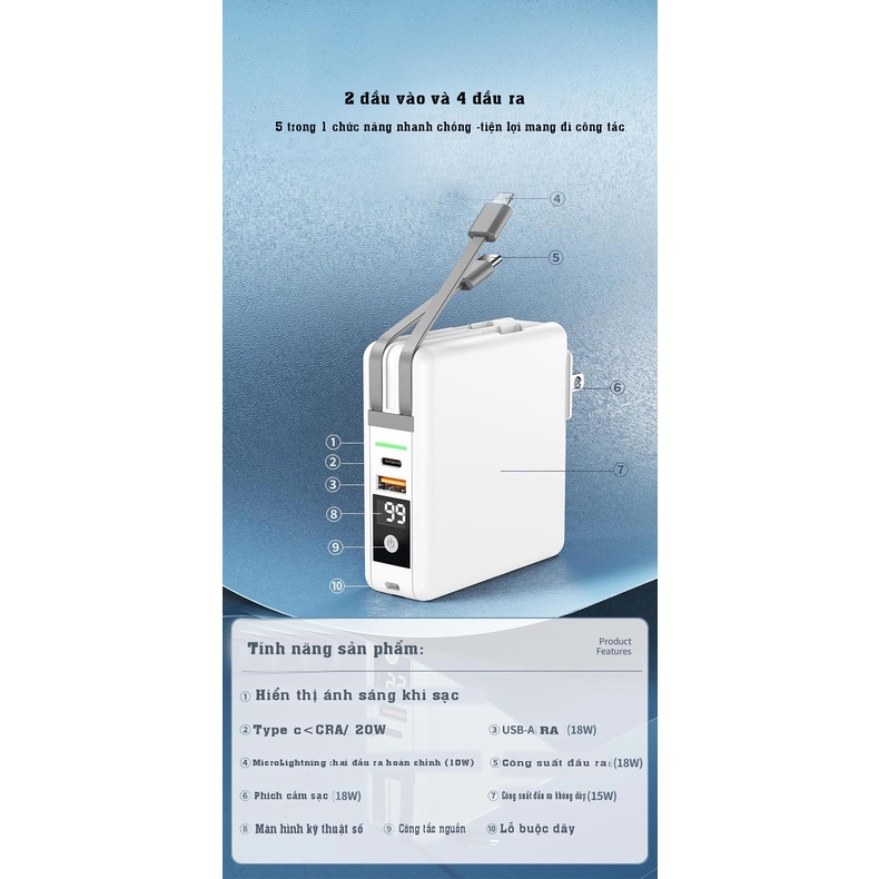 Cổng ra : 1 cổng USB ( QC3.0 /18W) , 1 cổng TYpe-C (QC3.0/18W) , 1 Dây sạc lightning , 1 dây sạc Type-C
