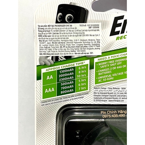 Bộ Sạc Energizer CHVCM4 bao gồm một máy sạc và 4 pin AA chính hãng công suất 2.000 mAh. Pin trong máy đã được sạc đầy pin khách hàng mua về sẵn dùng, khi pin báo yếu thì đem ra sạc đầy rồi sau đó tiếp tục dùng. Làm như vậy giúp kéo dài tuổi thọ pin.