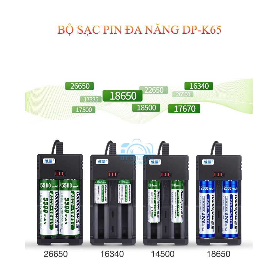 Sạc đa năng các loại pin 26650 ,22650 ,26500 ,18650 ,16340,17670, 18500 ,17500, 17335 Chính hãng DoublepowTự động thay đổi điện áp thích hợp cho các loại pin khácnhau