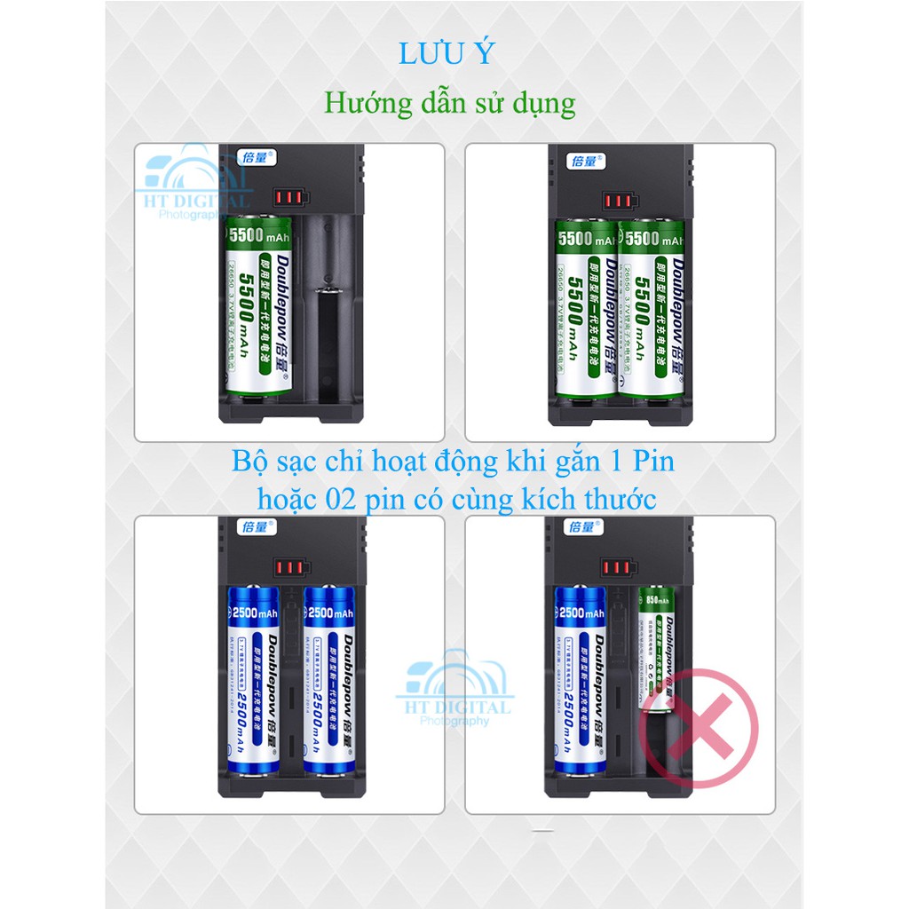 * Sạc 2 khe hãng Doublepow chuyên sản xuất các thiết bị pin, sạc sản phẩm đáng tin cậy đã được chứng chỉ ISO. Được khách hàng tin dùng sạc cho các dòng pin 26650 ,22650 ,26500 ,18650 ,16340, 17670, 18500 ,17500, 17335