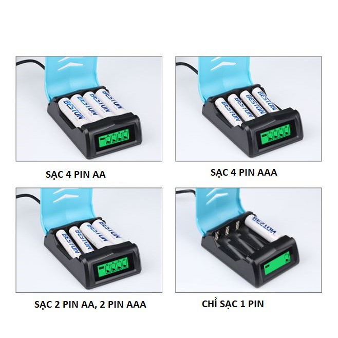 * Lưu ý: Chỉ sử dụng bộ sạc này để sạc pin Ni-MH 1.2V (khác hãng Beston cũng sạc được), không sạc pin dùng 1 lần hoặc các loại pin khác.