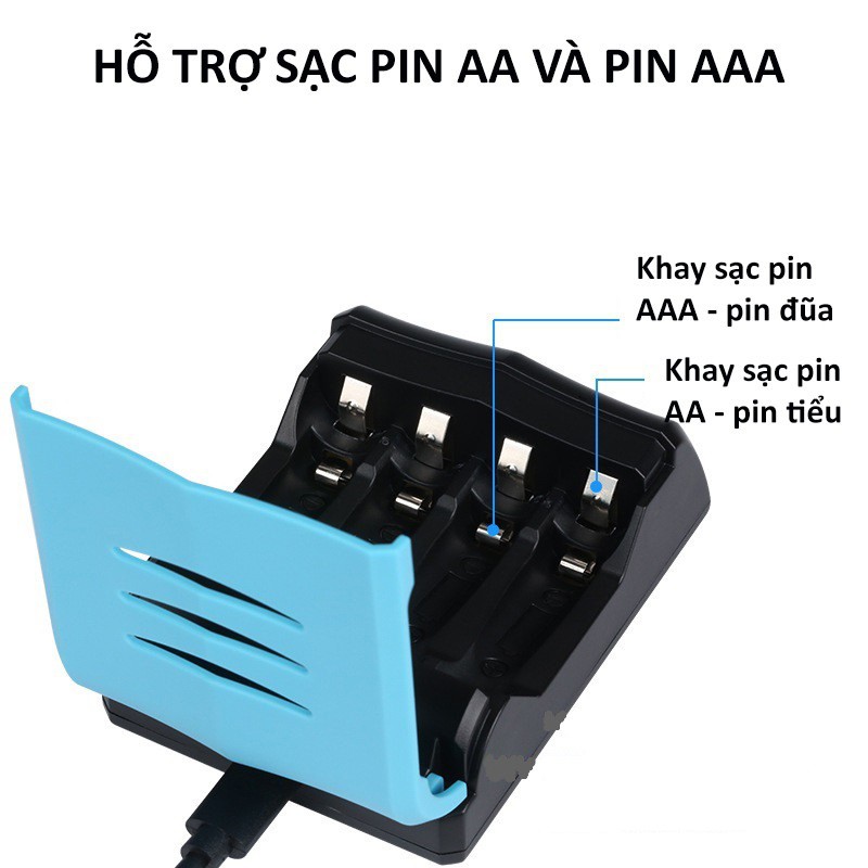 - Có thể sạc cho pin AA (pin tiểu) hoặc AAA (pin điều khiển, pin đũa)