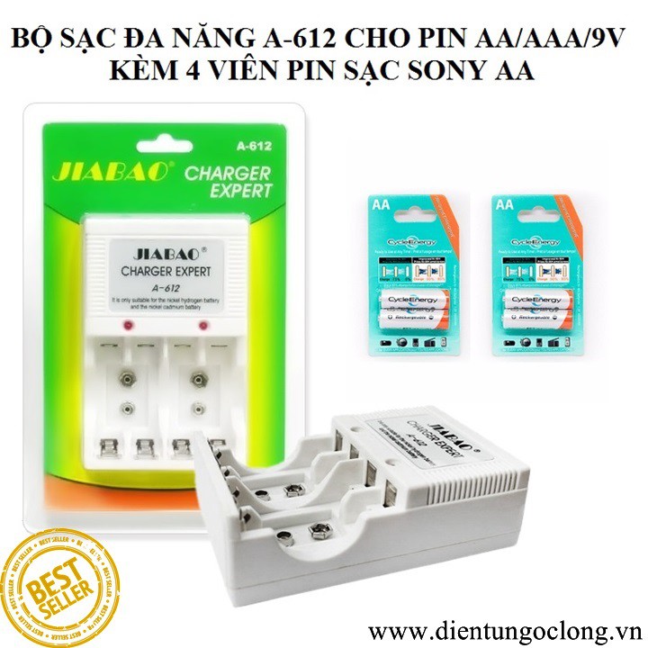 Bộ Sạc Pin Đa Năng A-612 Kèm 4 Viên Pin Sạc Sony AABộ sạc pin đa năng JIABAO. Thiết kế phụ kiện độc đáo đảm bảo nguồn năng lượng cho pin của thiết bị. Giúp sạc các loại pin trong thời gian ngắn, hiệu quả sạc cao, chất lượng bộ sạc tốt, không làm hỏng pin khi sạc.