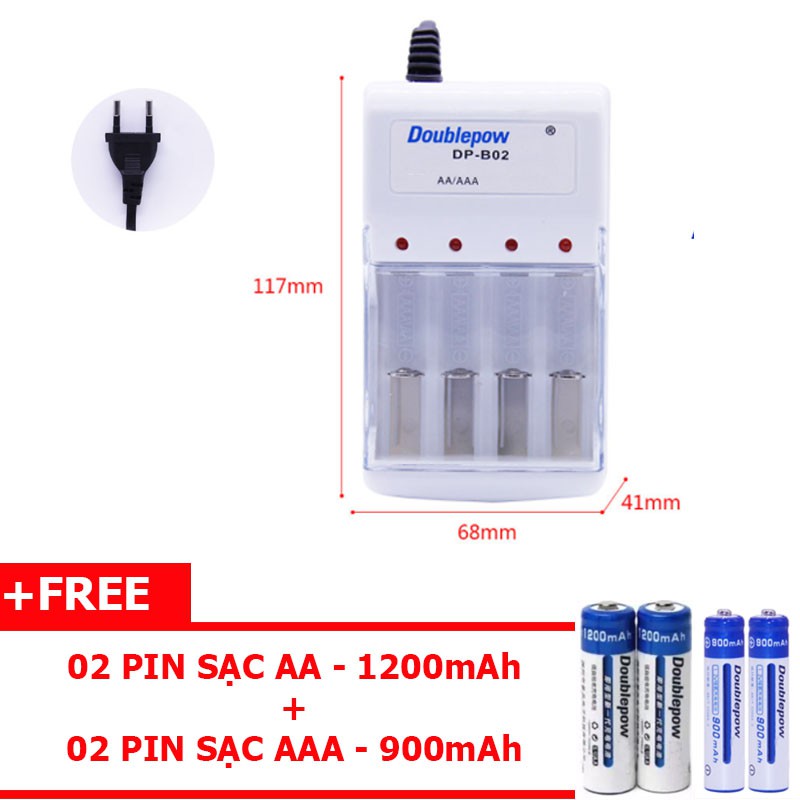Combo sạc Doublepow DP-B02 và 4 pin sạc Doublepow (02 viên AA 1200mAh và 02 viên AAA 900mAh)Các câu hỏi thường gặp:
