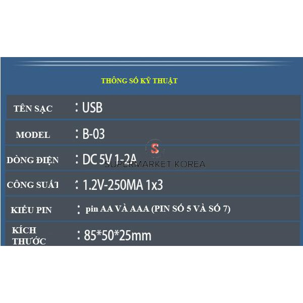 Sạc pin cho pin AA và AAA có khả năng sạc cả 02 loại pin AA và AAA cùng lúcThiết kế nhỏ gọn, thông minh, ban có thể dễ dàng để ở nhà hay mang đi du lịch
