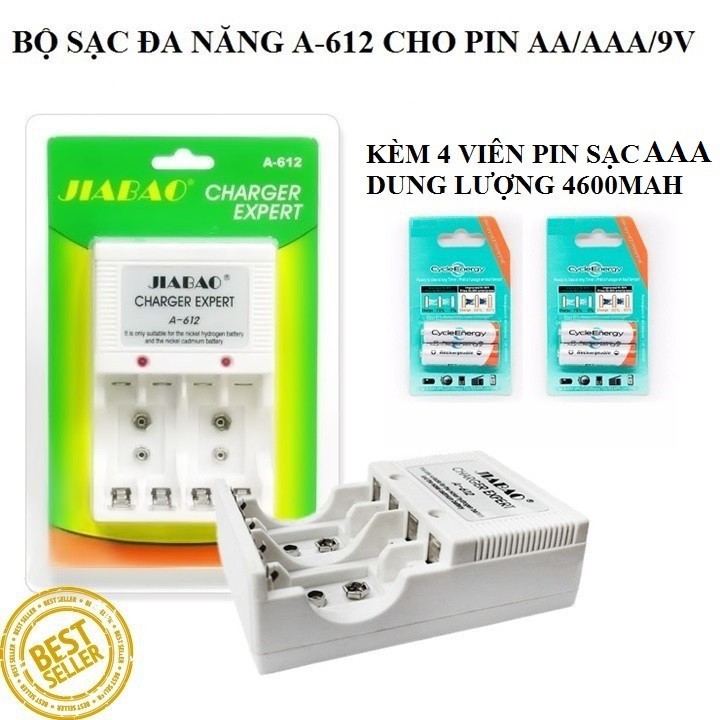 Bộ Sạc Pin Đa Năng Jiabao A612 Dành Cho Pin AA-AAA-9V Kèm 4 Viên Pin Sạc AAA