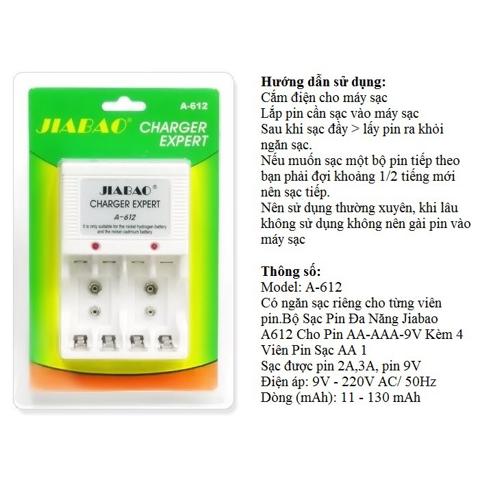 Có ngăn sạc riêng cho từng viên pin.Bộ Sạc Pin Đa Năng Jiabao A612 Cho Pin AA-AAA-9V Kèm 4 Viên Pin Sạc AA 1