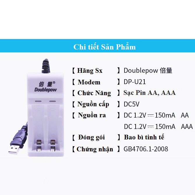 Bộ sạc pin Doublepow dùng sạc 2 viên pin AA/AAA cổng USB (DP-U21)