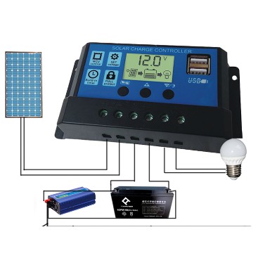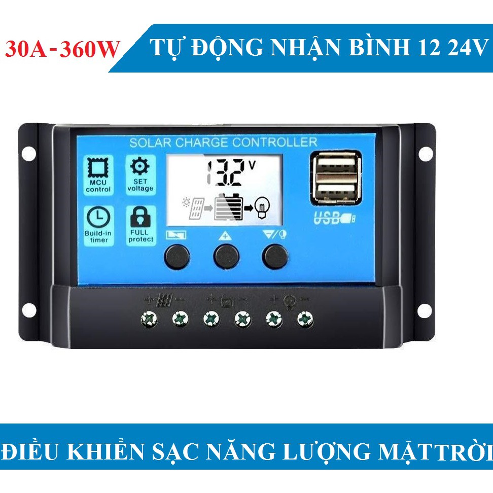 Điều khiển sạc năng lượng mặt trời, 12/24V/30A, có màn hình LCD hiển thị, có ngõ ra USB sạc điện thoại di độngDòng sạc 30A tương đương 360W