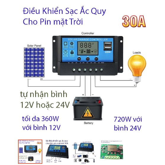 sạc pin năng lượng mặt trời - 30a bộ điều khiển sạc năng lượng mặt trời 12 24V tự nhận bình