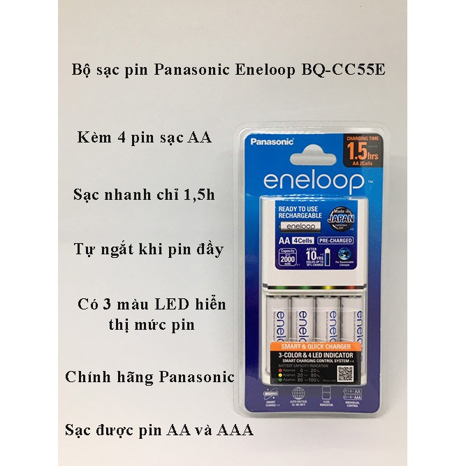 Bộ sạc pin Panasonic Eneloop nhanh , tự ngắt BQ-CC55 tặng kèm 4 pin sạc Eneloop 2000mahPanasonic TT sản phẩm: Sạc được từ 1 đến 4 pin AA, AAA