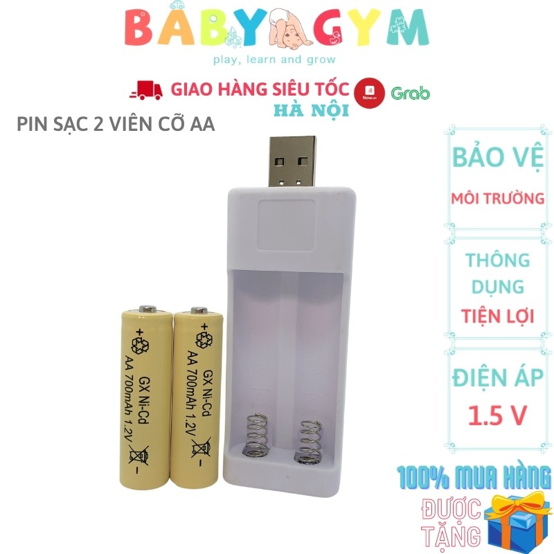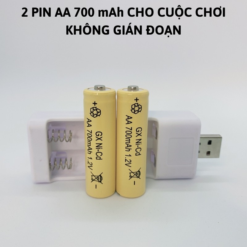 Bộ sạc bao gồm cục sạc pin đầu cắm USB tiện lợi và 2 pin sạc tiểu AA dung lượng 700mAh.