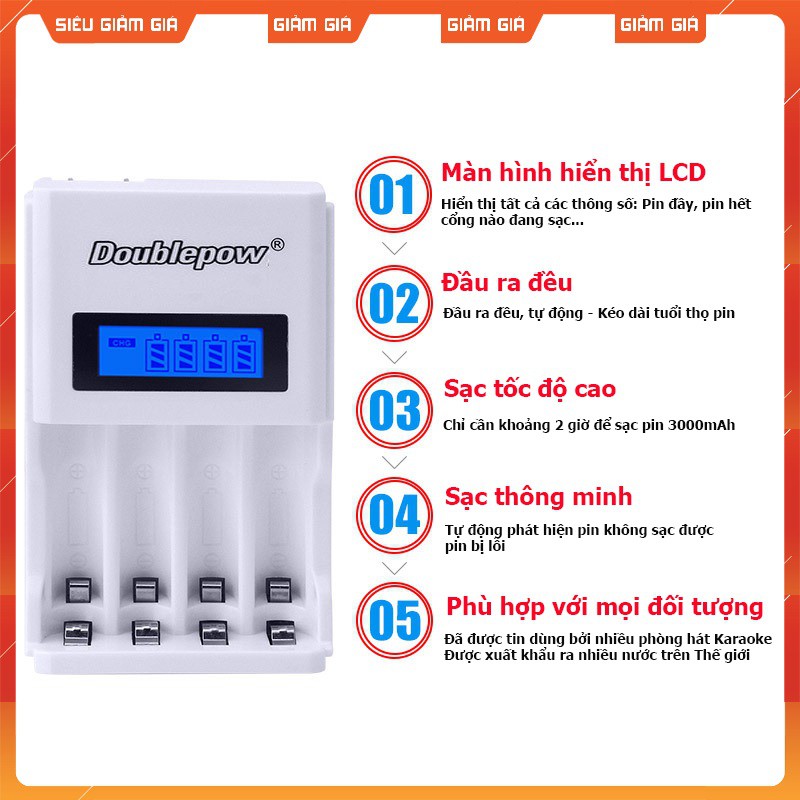 Tên sản phẩm: Bộ sạc pin tiểu (sạc pin AA, AAA) tốc độc cao Double pow, màn hình hiển LCD thông minh