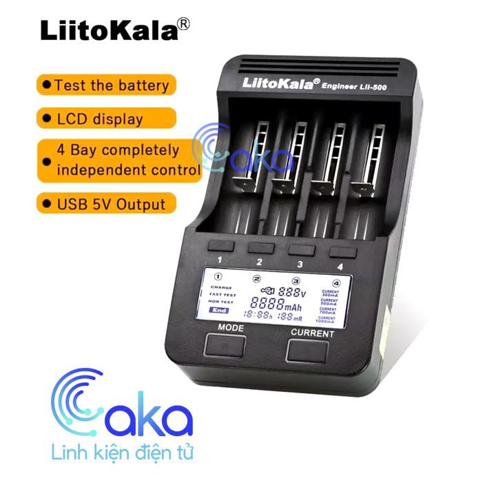 Bộ Sạc Và Tes Pin Đa Năng Liitokala Lii-500Bộ Sạc Pin Đa Năng Liitokala LII-500 Sạc 4 Pin 26650-18650-14500-16340 là bộ sạc thông minh có khả năng sạc hầu hết các loại pin Li-ion, NiMH / NiCd. Ngoài sạc pin, Lii-500 còn có chế độ kiểm tra pin, hiển thị dòng sạc, dung lượng, nội trở trên màn hình.