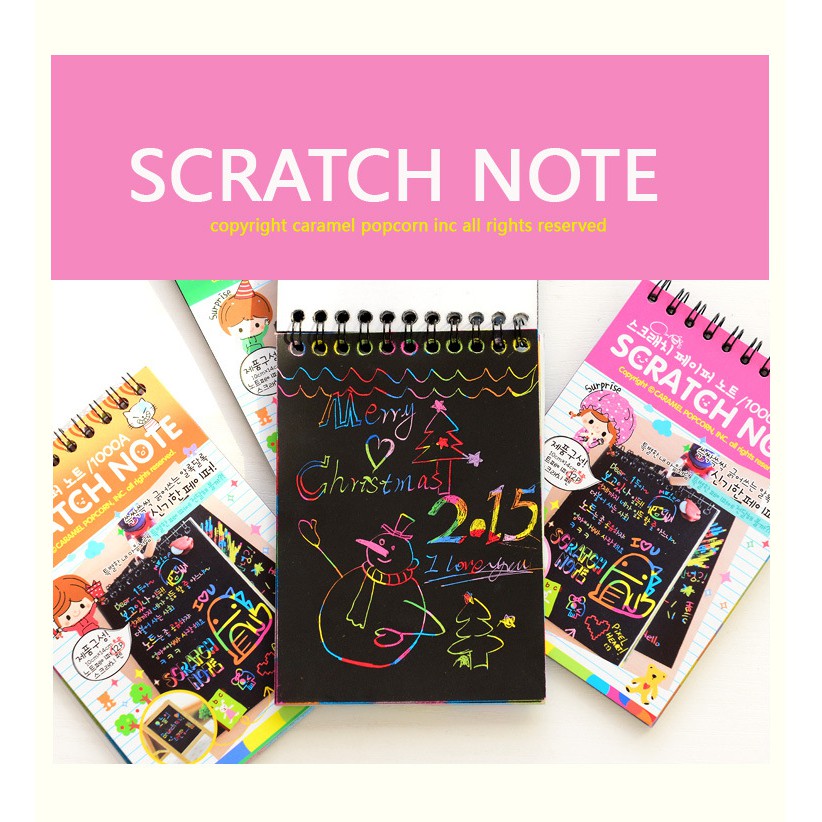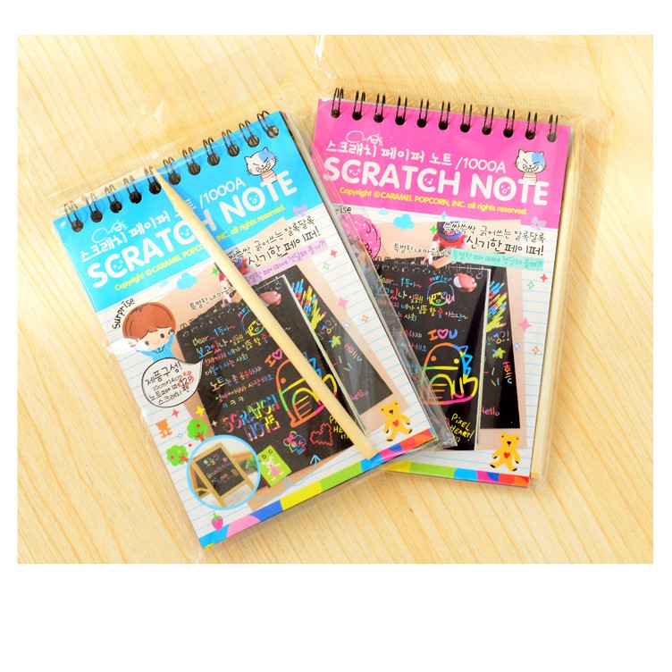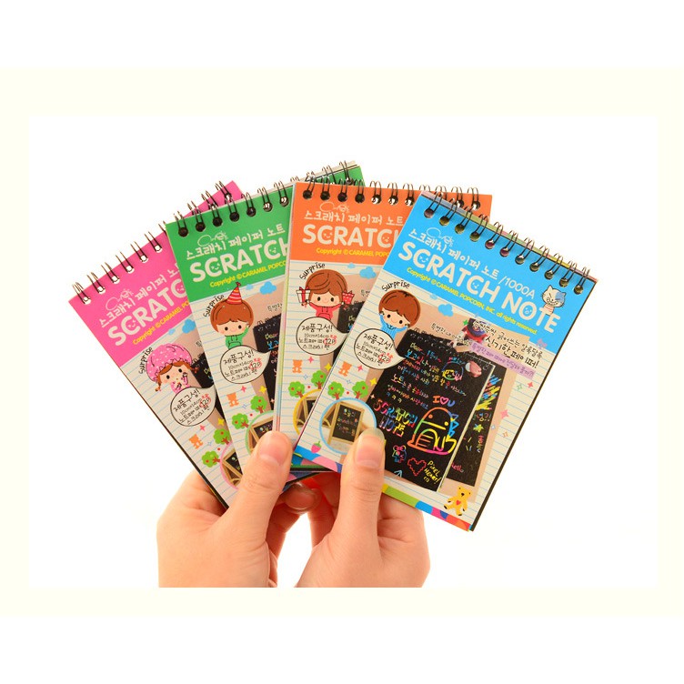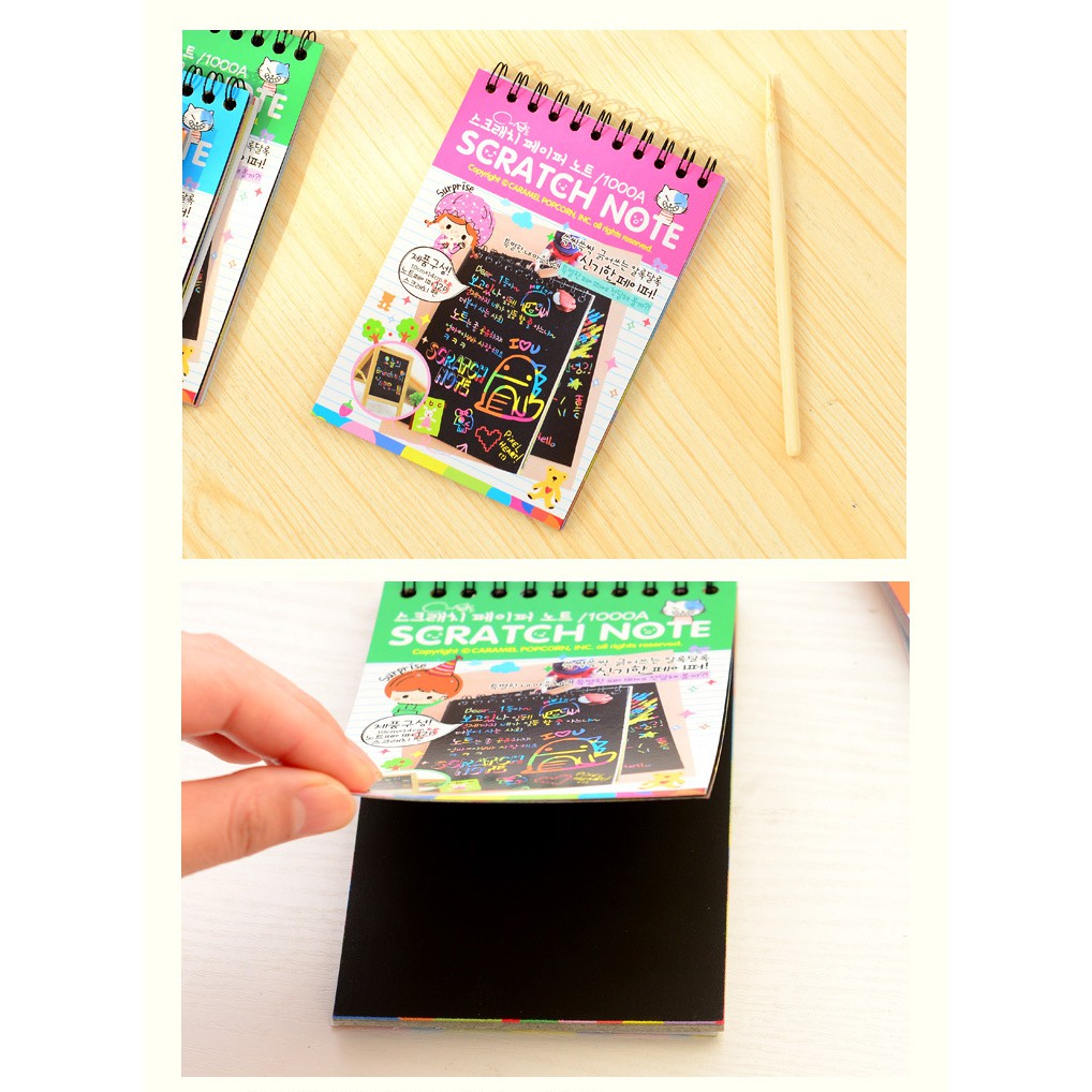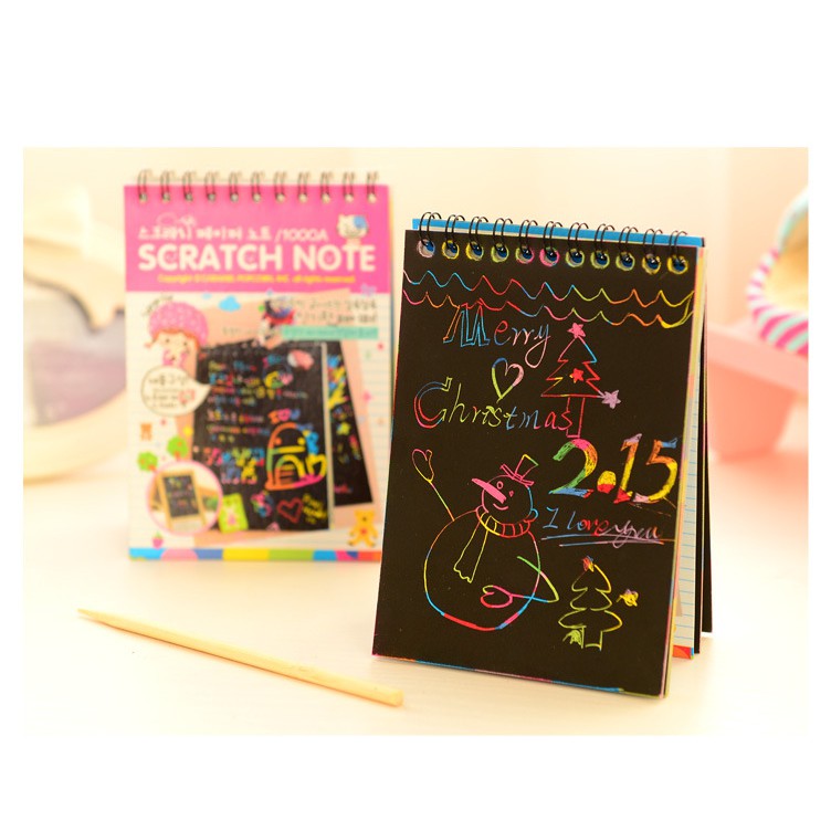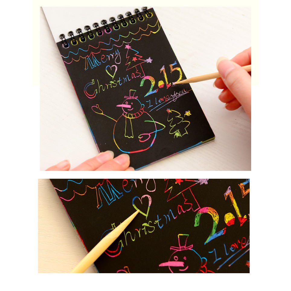 Bề mặt trang giấy vẽ được phủ 1 lớp sơn cạo màu đen hoàn toàn, các bé sẽ dùng bút vẽ ( được tặng kèm) vẽ lên tạo ra những hình ảnh đa màu vô cùng lung linh như 1 trang giấy ma thuật