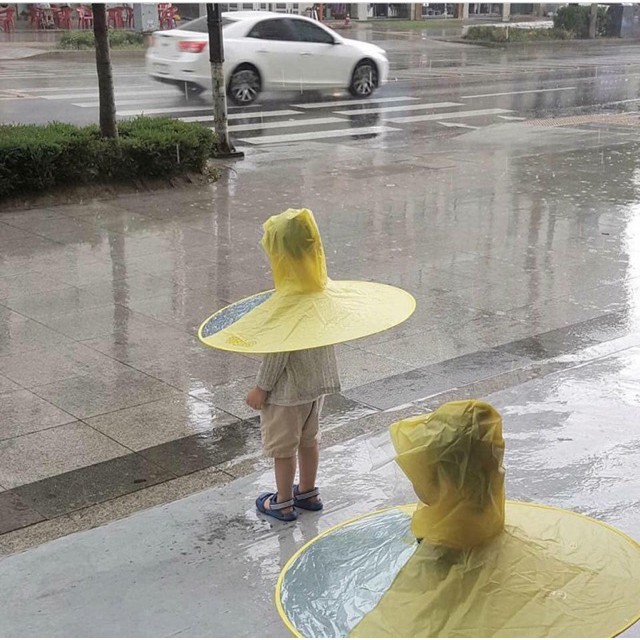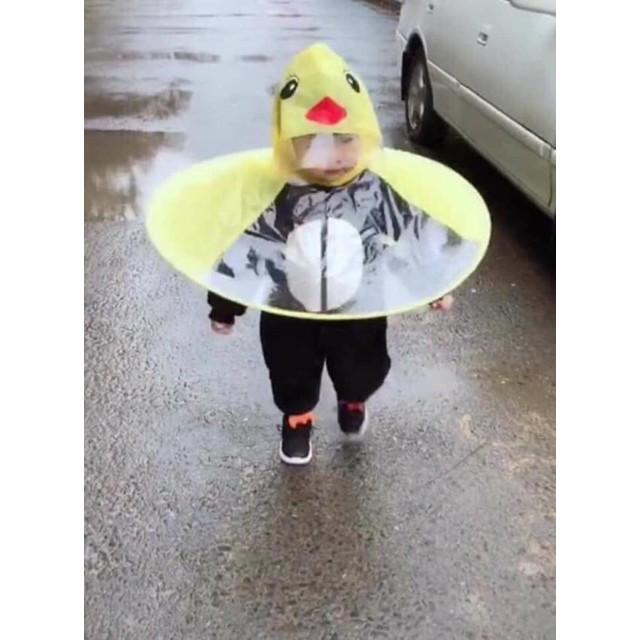 Em bé có bộ áo mưa màu vàng xòe phần dưới như mẫu ô, cộng mang đôi ủng "tông xoẹt tông" đi dưới trời mưa, trông không khác 1 chú vịt con chút nào.