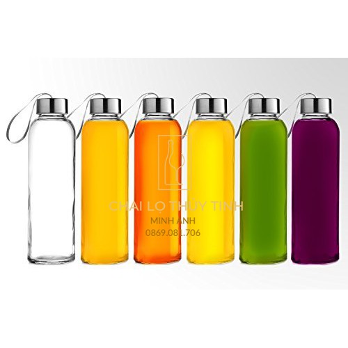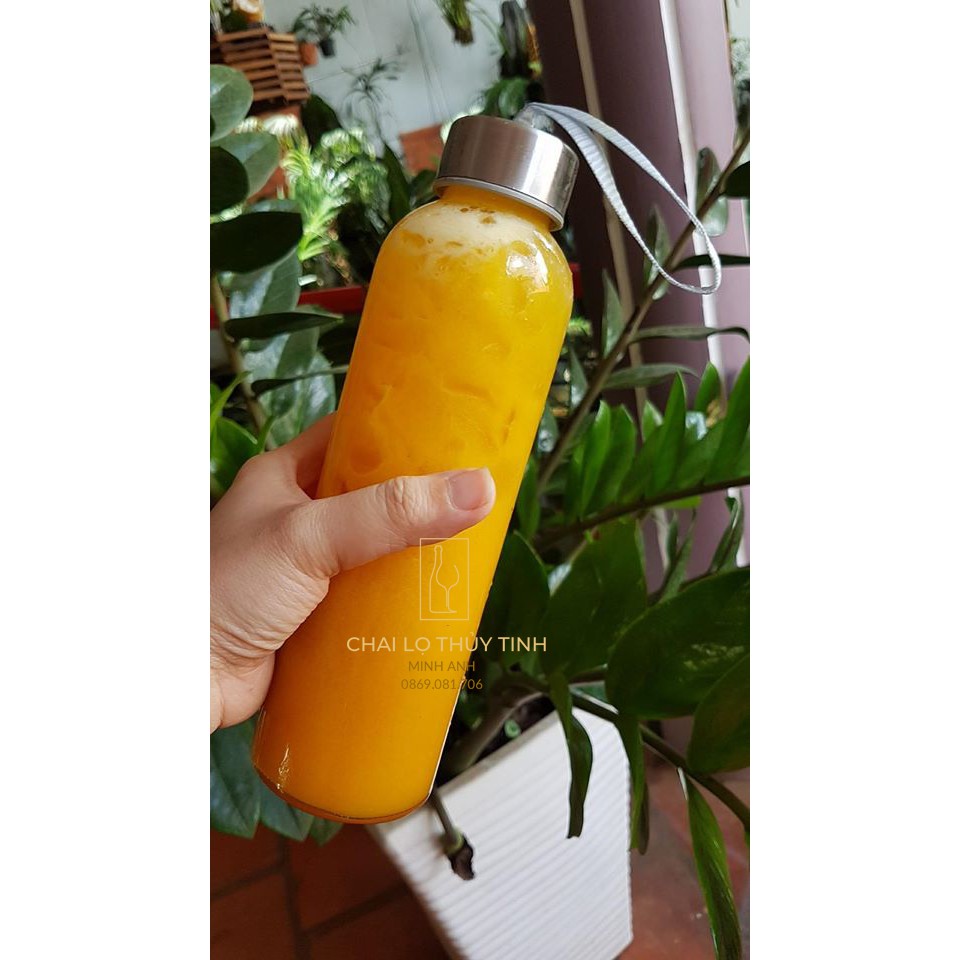 Chai thủy tinh dây xách thể tích 500ml sử dụng nắp nhựa bọc inox, có gioăng cao su chống tràn, dây dù gắn trên đầu nắp.