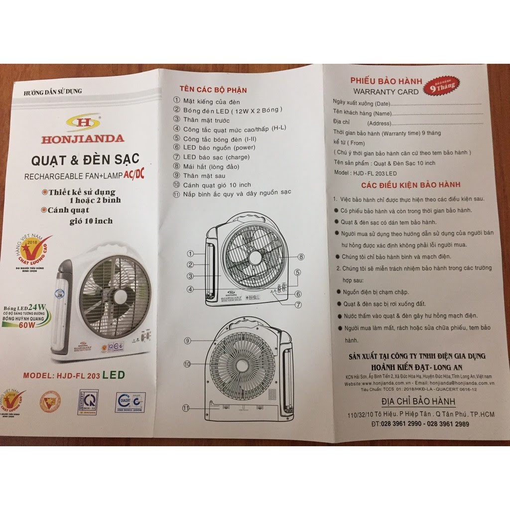 - Quạt sạc HJD-FL 203 đến từ thương hiệu uy tín Việt Nam: Honjianda, một thương hiệu đồ điện cực nổi tiếng, có lịch sử phát triển lâu đời với nhiều mặt hàng tiện dụng.