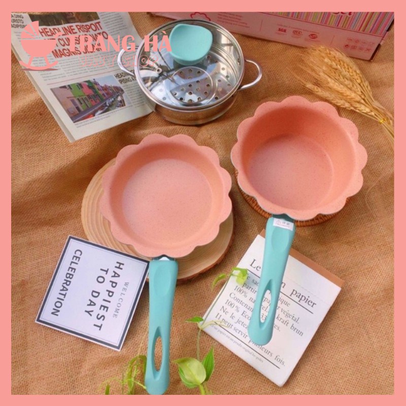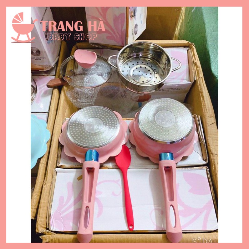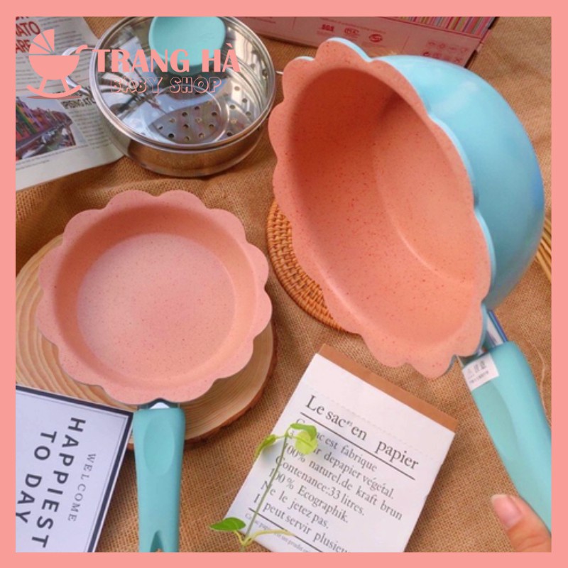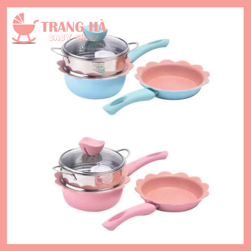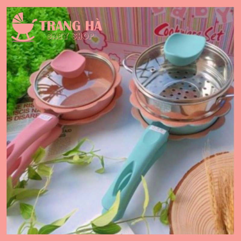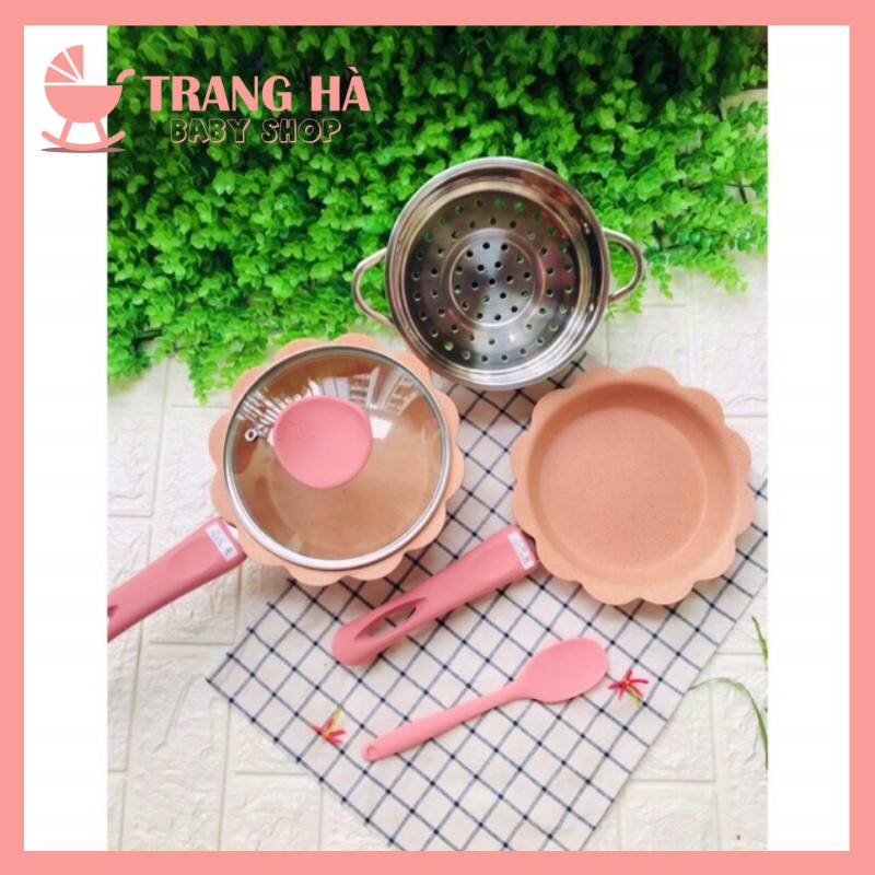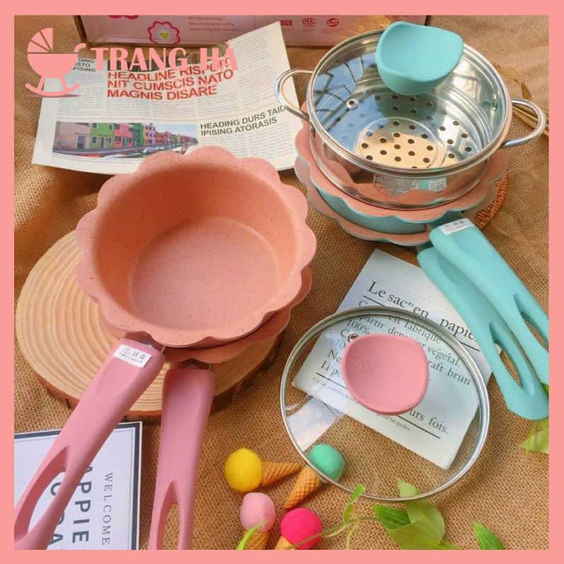 BỘ NỒI CHẢO CHO BÉ ĂN DẶM HÌNH HOA CAO CẤP, THÀNH NỒI 6 LỚP, TRÁNG MEN ĐÁ CHỐNG DÍNH, KÈM XỬNG HẤP (TẶNG KÈM THÌA NẤU, QUẤY)- Nồi và chảo được làm từ hợp kim cao cấp 6 lớp tráng men hoa văn đá chống dính cực tốt, thiết kế hình hoa cực dễ thương màu sắc trang nhã.
