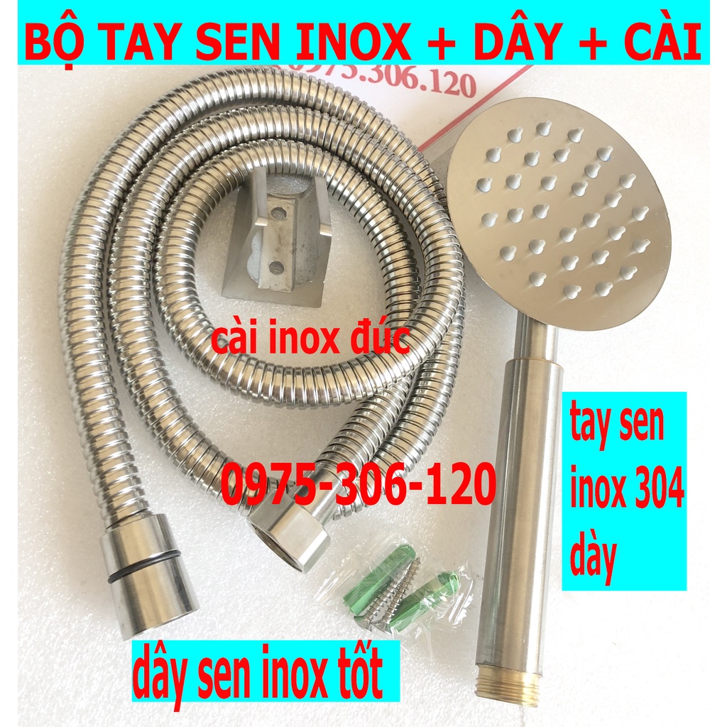 - phân loại tay sen+dây+cài đủ bộ gồm: 1 dây inox dài 1,4m, 1 tay sen inox tròn núm ra tia nước bằng cao su, 1 cài inox 304 đúc