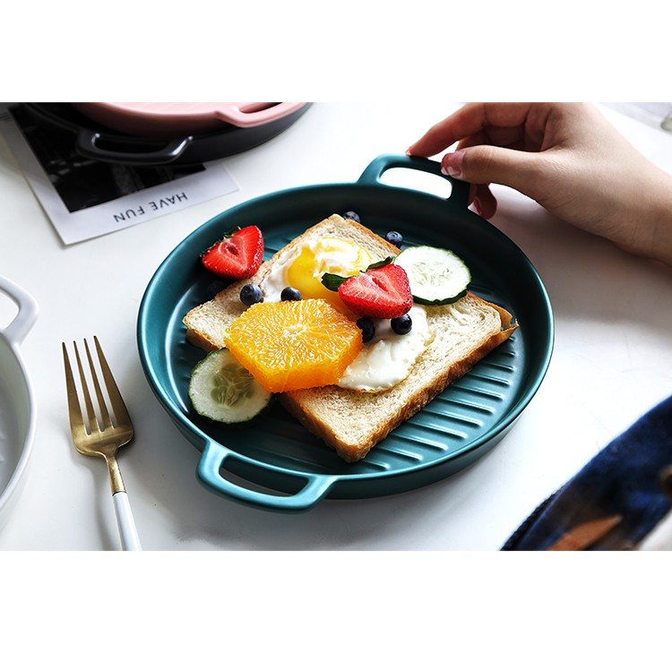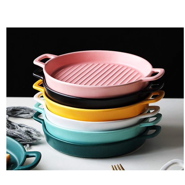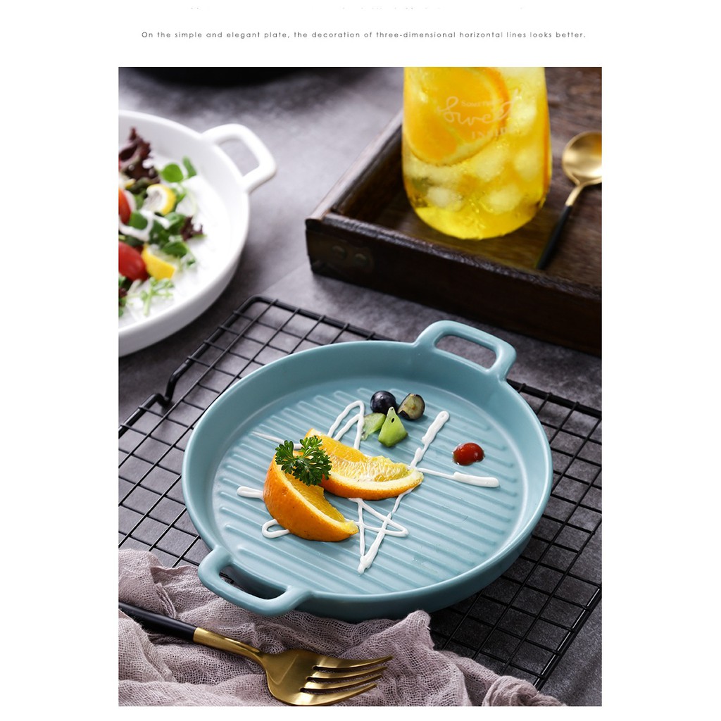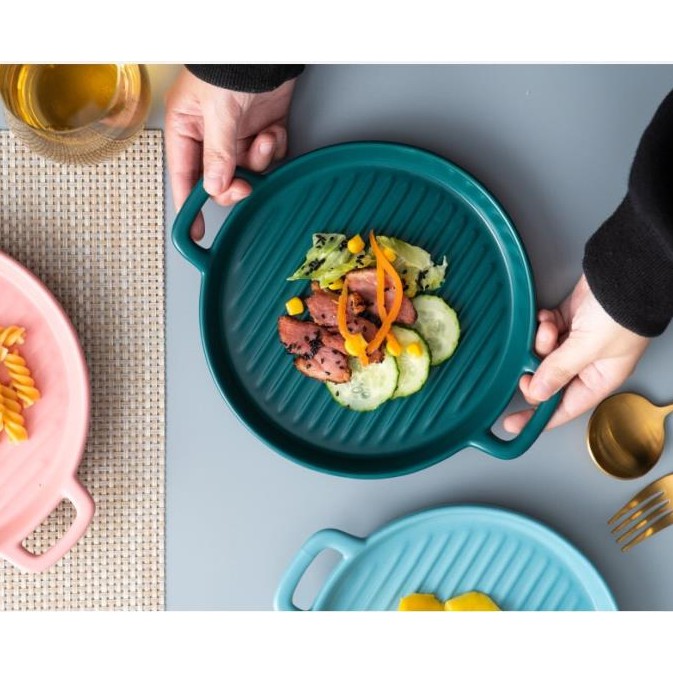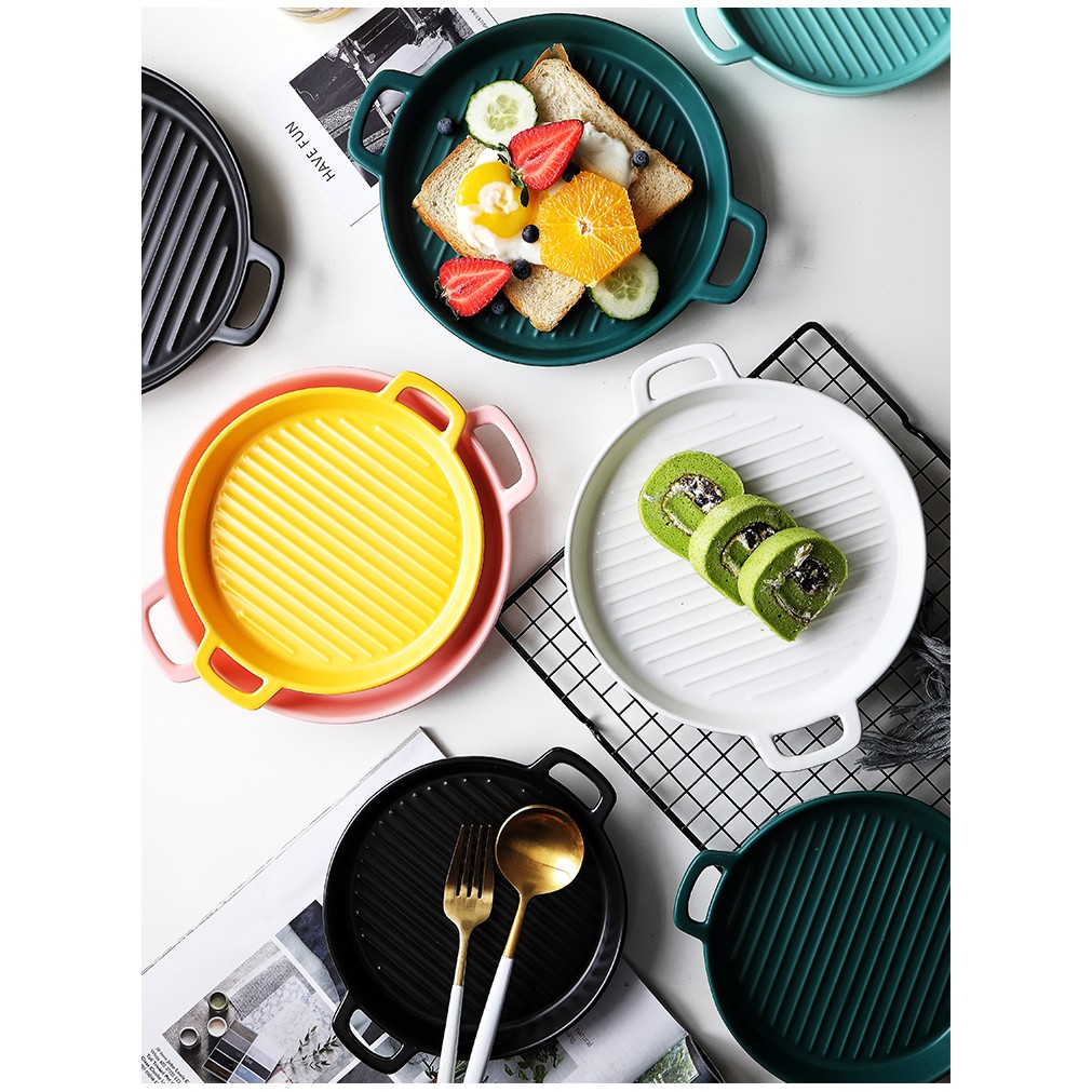 Nhà cửa & Đời sống > Bộ đồ bàn ăn > Dĩa || (SALE XẢ KHO) Khay nướng tròn màu pastel phong cách Bắc Âu, đĩa tròn quai sứ cao cấp xuất khẩu, chọn màu tùy ýCòn hàng