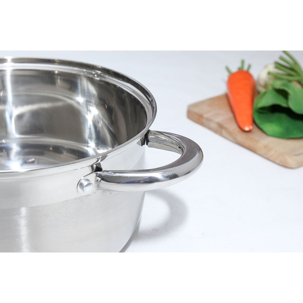 Đáy phẳng cấu tạo 3 lớp (inox 430 - nhôm nguyên chất - inox 430). Chất liệu inox 430 an toàn khi nấu nướng, dùng được trên bếp từ; lớp giữa nhôm nguyên chất cho nồi bắt và truyền nhiệt tốt, nấu ăn nhanh.