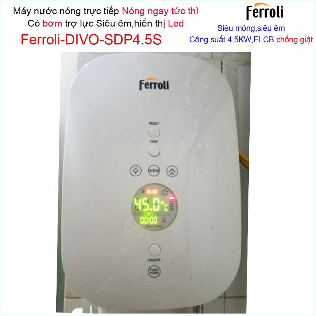 Máy nước nóng Ferroli Divo SDP 4.5S có bơm chống giật màn hình LED hiển thị nhiệt độ, Bình nước nóng trực tiếp Ferroli chính hãng ổn định nhiệt độ nước cho người già và trẻ emMáy nước nóng Ferroli được sản xuất tại nhà máy Ferroli -Italy, 1 thương hiệu hàng đầu về máy nước nóng, máy bơm nhiệt, thiết bị nhà bếp.