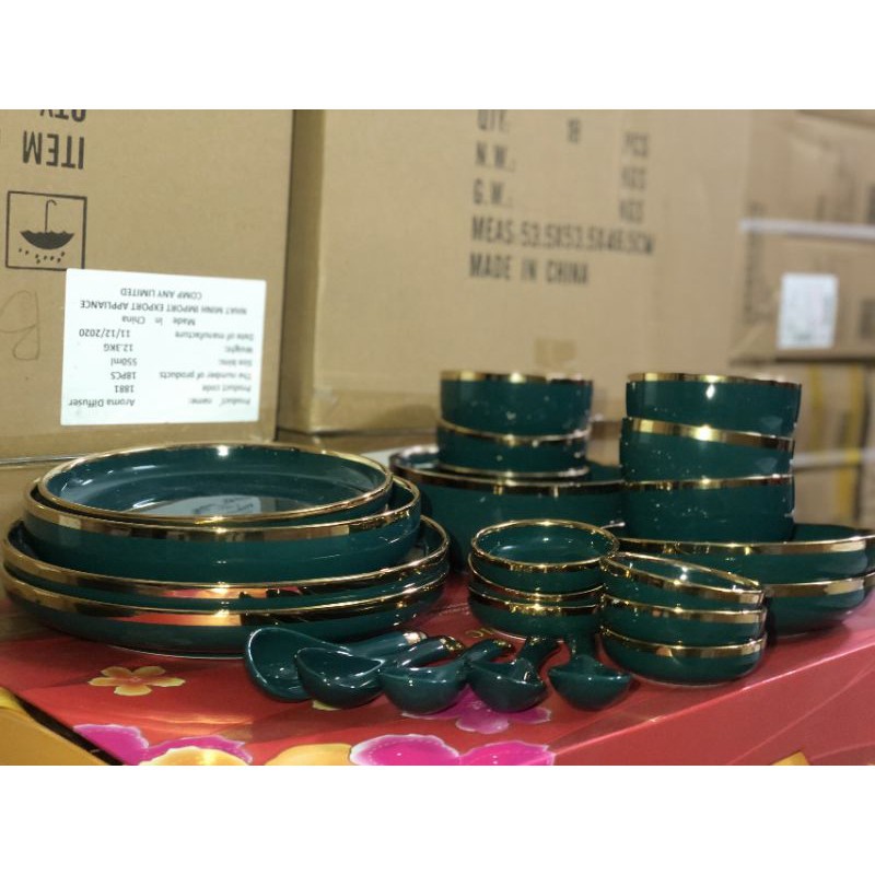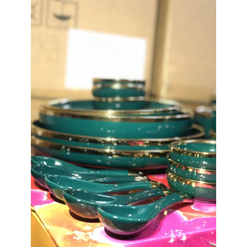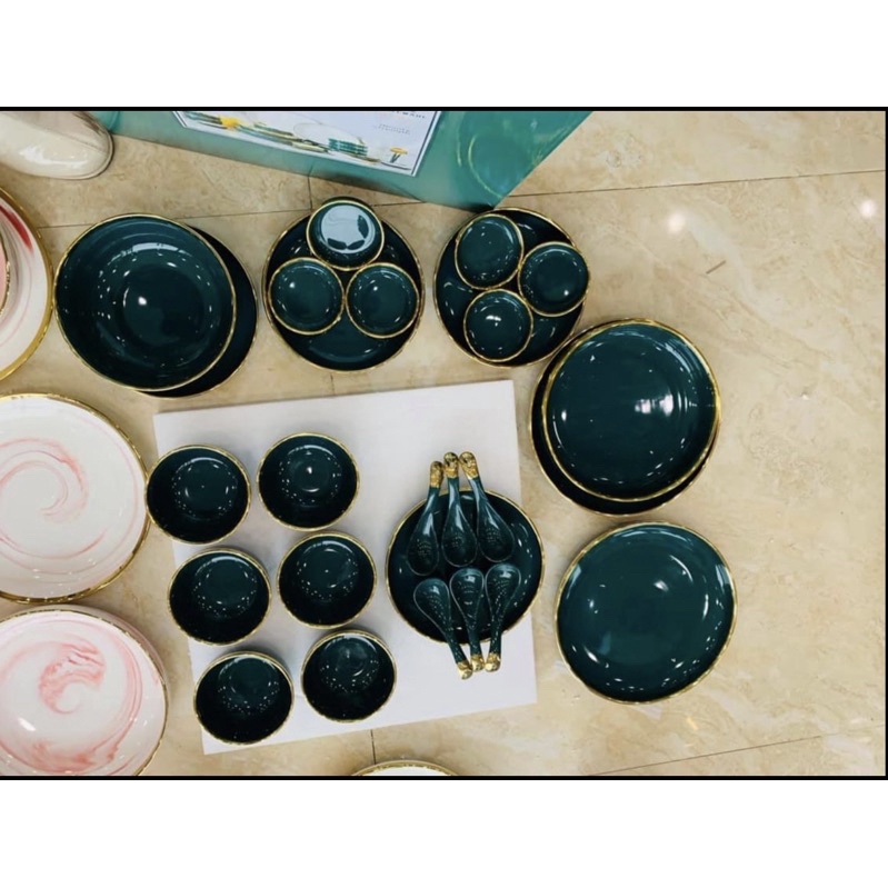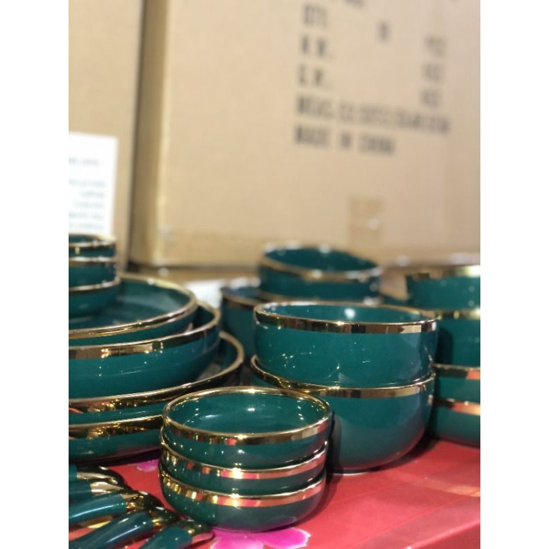 Giới thiệu có sẵn) bát ăn cơm , đũa , đĩa bầu dục sư xanh viền vàng- xanh cổ vịt .