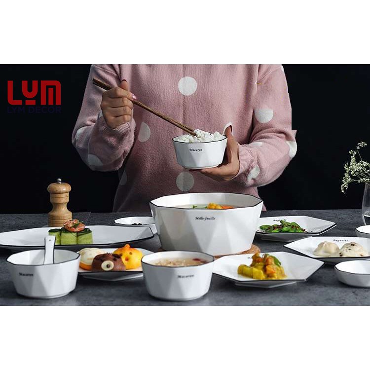 Bộ bát đĩa sứ kim cương trắng được thiết kế theo phong cách Bắc Âu. Các đĩa, bát đều có hình bát giác, khi đặt cạnh nhau có thể ghép hình vừa vặn, đẹp đẽ thành 1 bàn tiệc rực rỡ sắc màu lại cực kì độc đáo và sáng tạo.