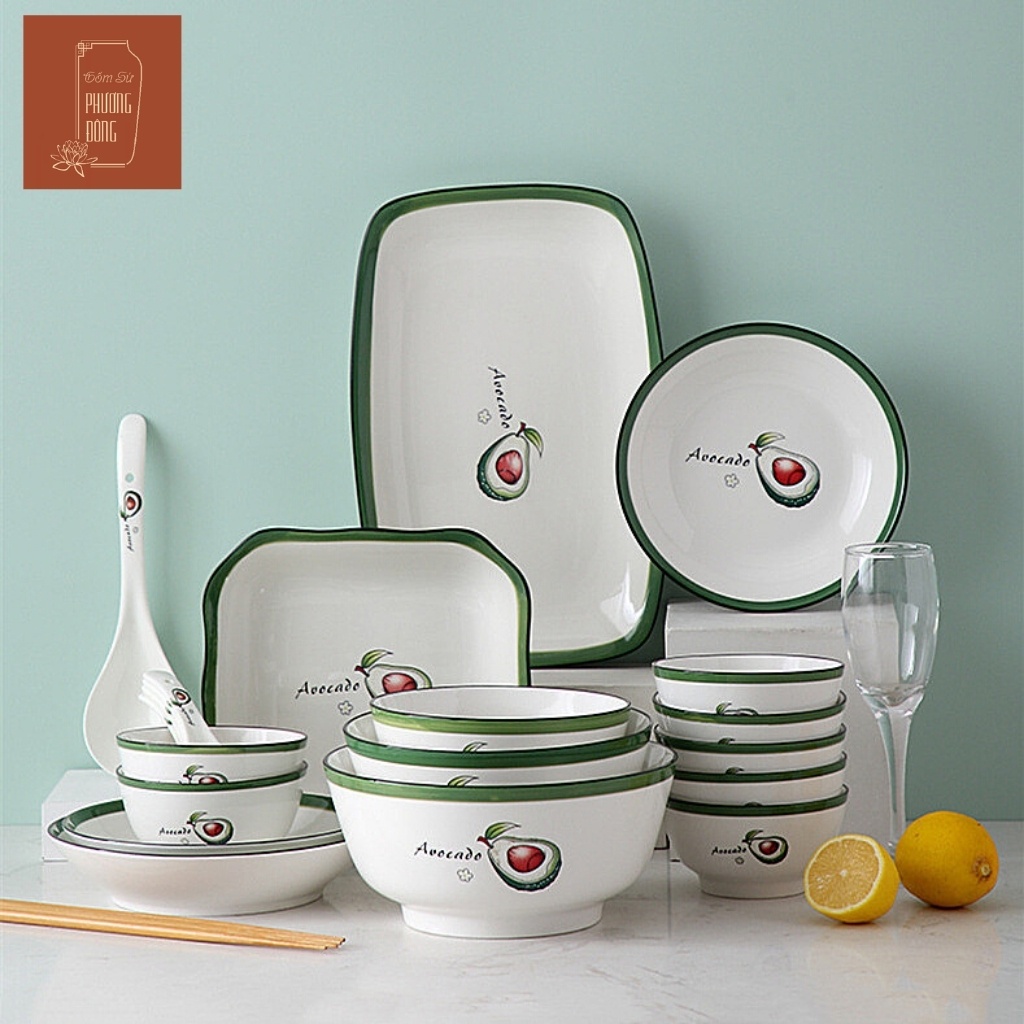 [Có sẵn] Bộ bát đĩa sứ Phương Đông 21 món họa tiết quả Bơ dễ thương, chén đĩa dày dặn, men sáng đẹp