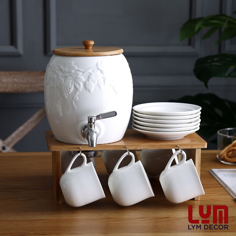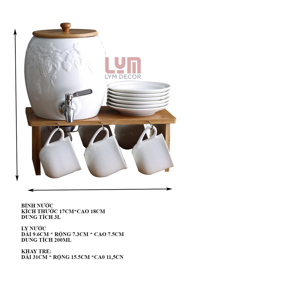 1 SET GỒM 1 BÌNH NƯỚC SỨ 3L + 6 CỐC SỨ 200ML + 6 ĐĨA ĐỰNG CỐC + KỆ GỖ như hình