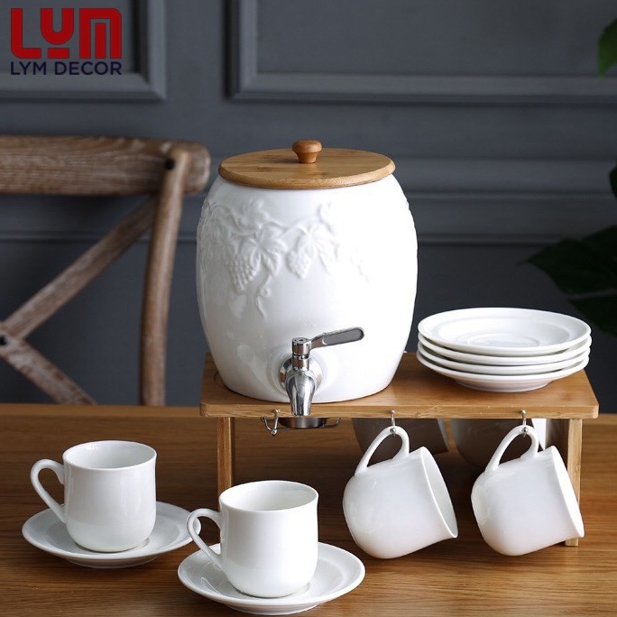 Giới thiệu (SẴN) Bộ Bình nước 3L NHO PHÚ QUÝ kèm giá gỗ + 6 cốc/đĩa sứ cao cấp, sứ trắng cường lực - hàng xuất Âu