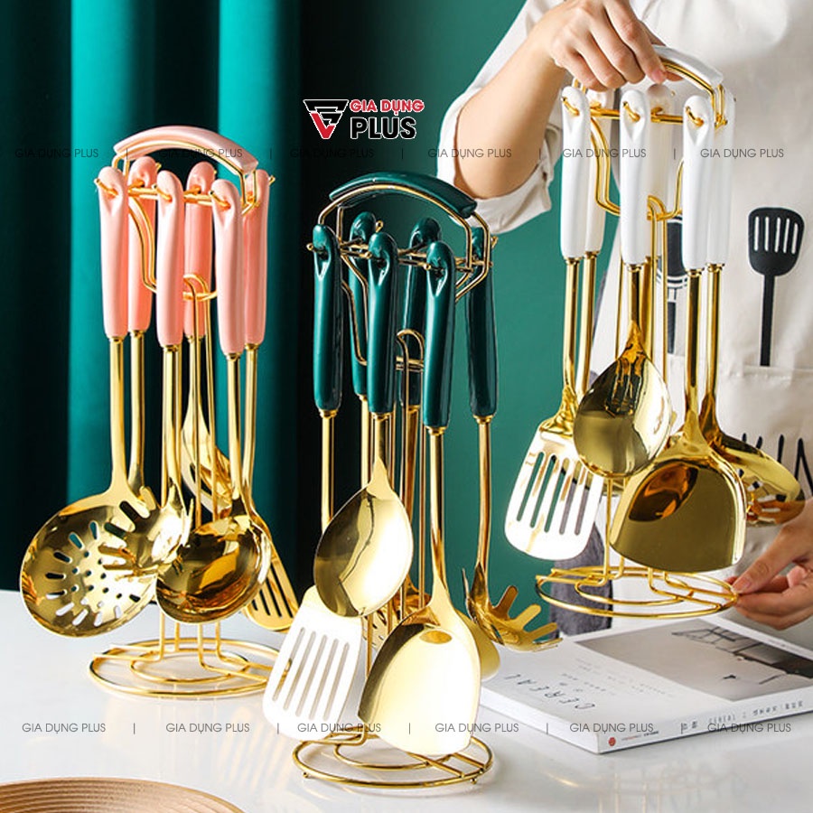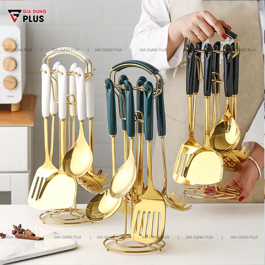 [ Có Sẵn ] Bộ Thìa / Muôi / Muỗng /Xẻng Nấu Ăn Đa Năng Gốm Sứ Và Giá Treo Gọn Gàng (7 Món) Cao Cấp |