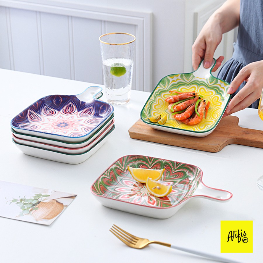 Đĩa vuông sứ có tay cầm phong cách châu âu hoạ tiết Bohemia – dùng cho lò nướng Alifis