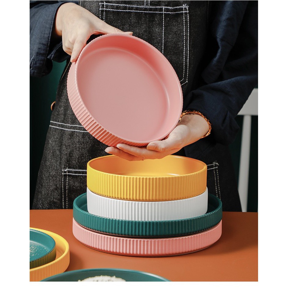 ĐĨA TRÒN SÂU LÒNG VÂN SỌC 21CM, SỨ MÀU LA MÃ CAO CẤP KHÔNG CHÌCHẤT LIỆU