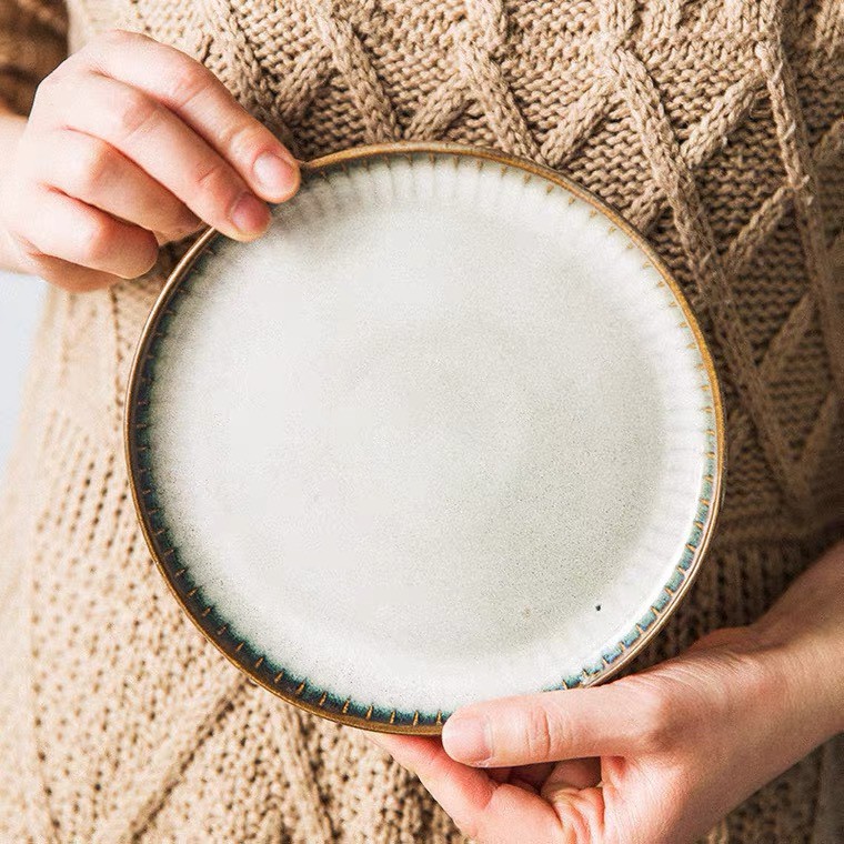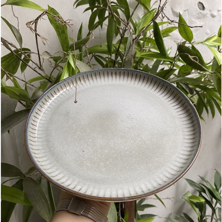 (SẴN) Đĩa sứ tròn viền sọc nâu vàng Star phong cách Bắc Âu - hàng cao cấp không chì xuất khẩu