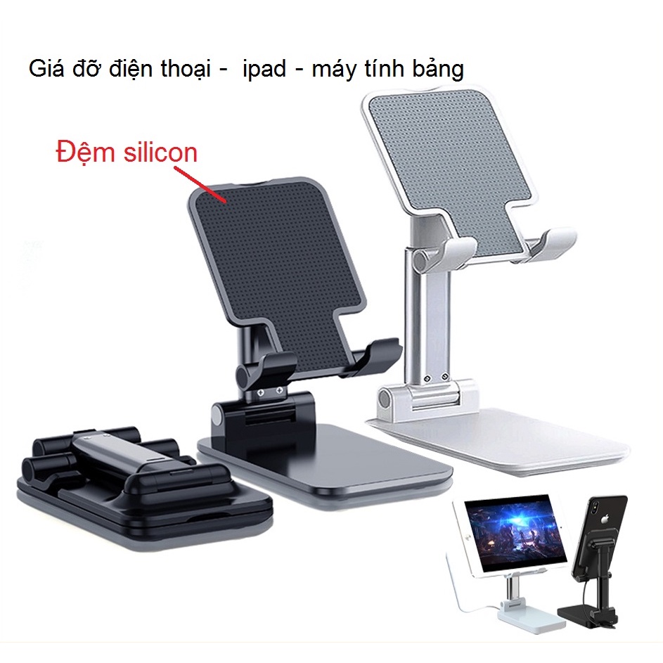 - Giá đỡ điện thoại để bàn, giá để máy tính bảng, ipad gấp gọn, miếng đệm silicon mặt trước bảo vệ máy tính bảng không bị trầy xước. Chân đế cũng được trang bị đệm cao su chống trượt cố định trên mặt phẳng trơn trượt , tiện dụng và thiết kế rỗng ở phía dưới có thể sạc thiết bị cùng một lúc.
