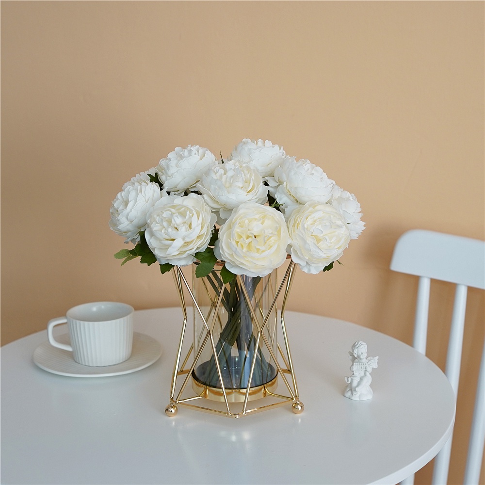 về chỉ việc thả các cành vào bình là bó hoa sẽ tự toả thành bó tròn đầy đặn, nhìn thấy xinh lắm rồi ạ. Đặc biệt nhất là Bình làm bằng khung thép siêu dày và chắn chắn, sơn màu vàng đồng bóng bẩy sang trọng, ống thuỷ tinh bên trong màu hổ phách nhạt, tổng thể bình nhìn hài hoà và sang trọng.