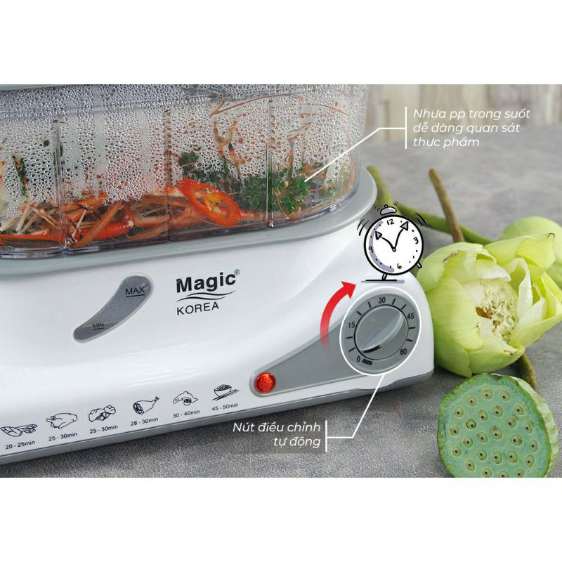 Máy hấp thực phẩm đa năng 03 tầng Magic Korea A61 sẽ giúp bạn hâm, hấp thực phẩm một cách nhanh chóng và giữ được trọn vẹn chất dinh dưỡng khi nấu. Với dung tích lớn lên đến 3 tầng riêng biệt cho bạn thực hiện nhiều món ăn cùng lúc. Đây là một sản phẩm không thể thiếu được của những người nội trợ thông minh, là một trợ thủ đắc lực giúp bạn có nhiều thời gian hơn dành cho công việc bếp núc.Đặc điểm nổi bật