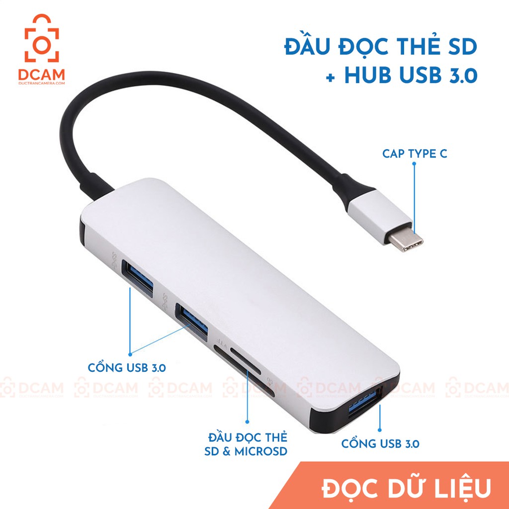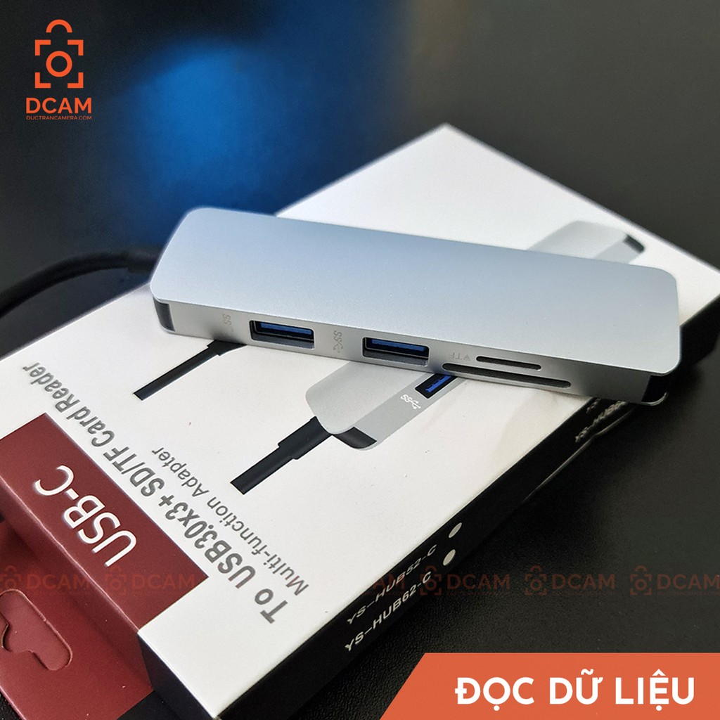 HUB CHIA TYPE C SANG 3 CỔNG USB 3.0 VÀ CỔNG ĐỌC THẺ SD/TFCổng vào : USB 3.1, Type-C Cổng ra : 2 chuẩn ra khác nhau 3 cổng USB 3.0 với tốc độ truyền tải lên tới 5 Gbps 1 cổng thẻ nhớ SD/TF