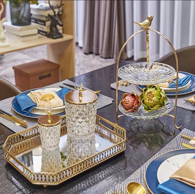 Khay gương Được thiết kế tinh xảo với màu sắc sang trọng, bắt mắt, có sự kết hợp tinh tế giữa kim loại và gương tạo nên tổng thể hài hòa, thích hợp làm đồ trang trí trong gia đình.