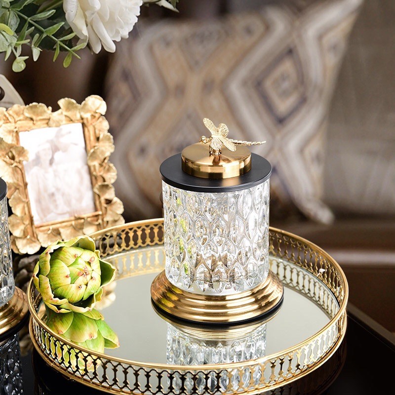 -Decor bàn trà rất sang, khay gương đi kèm lọ hoa, nến, lọ thủy tinh rất đẹp