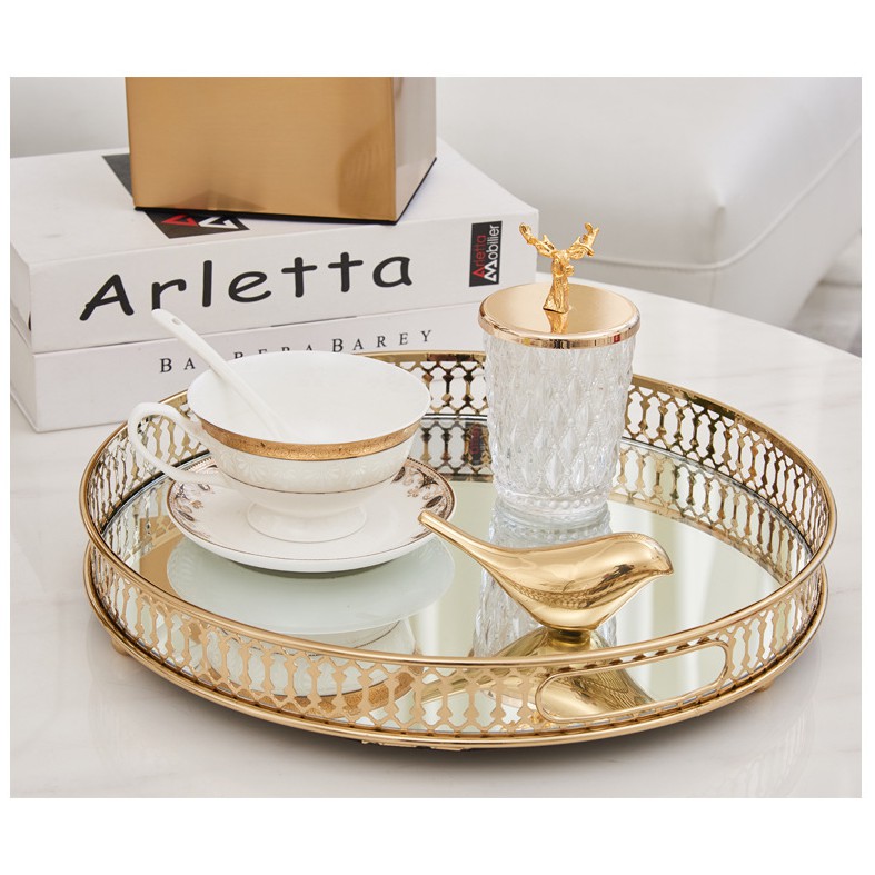 Giới thiệu (SẴN) Khay tráng gương viền mạ vàng tròn/chữ nhật cao cấp, khay decor phong cách Bắc Âu