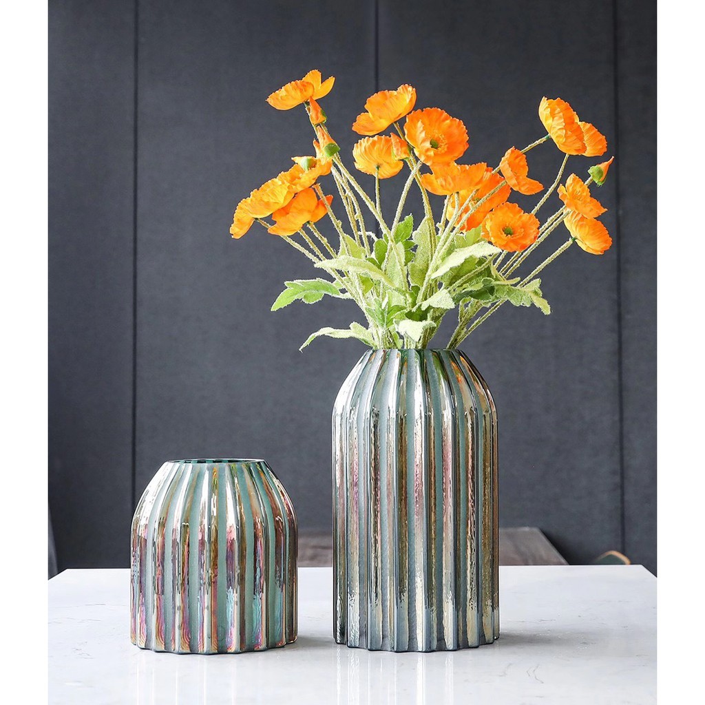 Lọ hoa đèn lồng ánh nhũ có 2 màu hồng tím và xanh ngọc, có tạo hình đèn lồng khum miệng độc đáo. Màu ánh nhũ cực kì bắt mắt, tạo vẻ kì ảo, vừa có thể dùng để cắm hoa, vừa có thể dùng làm đồ trang trí trong nhà...