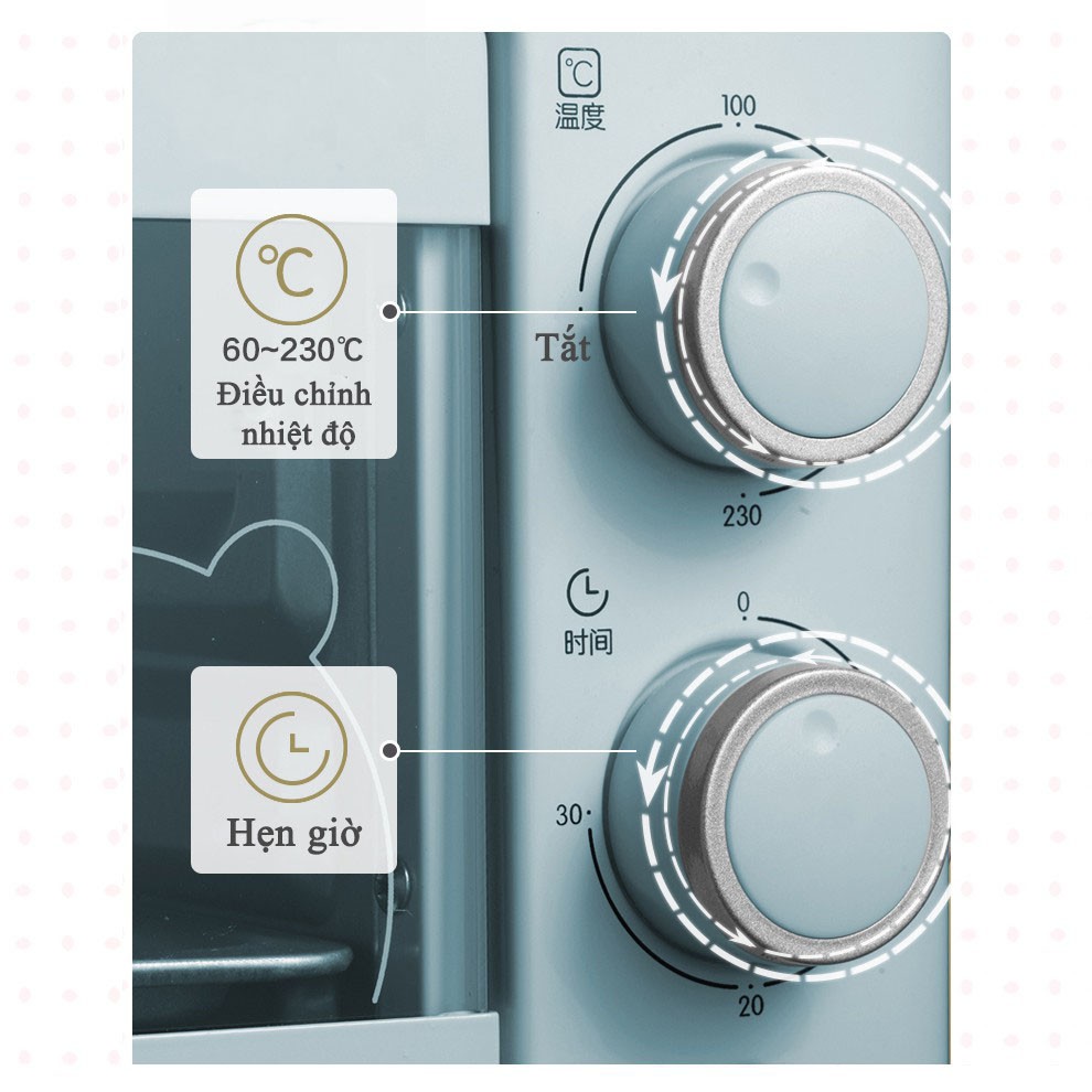 - Lò có thể điều chỉnh nhiệt độ từ 100 - 230 độ C và hẹn giờ tối đa 30 phút.