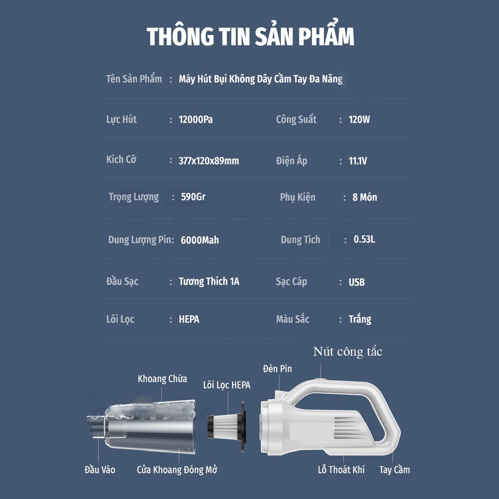 - Lực hút: 12000Pa