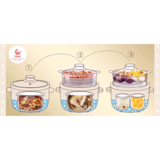 Nồi gồm 1 thố 1,8L và 2 thố 0,5L kèm giá hấp, các mẹ có thể hầm 1 thố 1,8L đủ cho cả gia đình cùng ăn hoặc nấu 2 thố nhỏ 0,5L 2 món khác nhau cho bé ăn đổi bữa