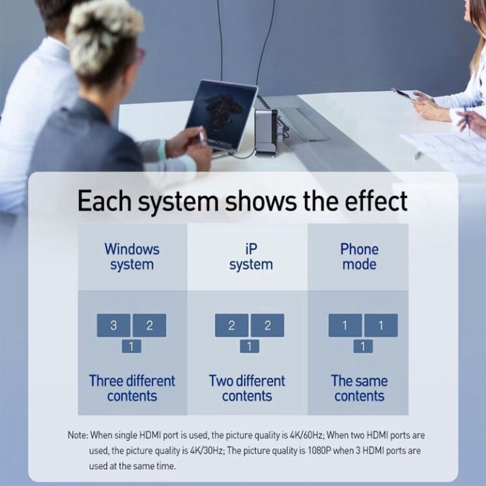 - Khi sử dụng một cổng HDMI, chất lượng hình ảnh là 4K / 60Hz, khi sử dụng hai cổng HDMI, chất lượng hình ảnh là 4K / 30Hz, khi sử dụng 3 cổng HDMI, chất lượng hình ảnh là 1080p