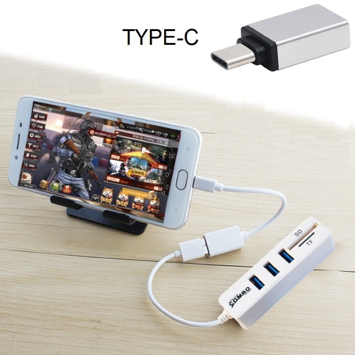 BỘ SẢN PHẨM CHIA 3 CỔNG USB KÈM ĐỌC THẺ NHỚ + ĐẦU TYPE-C HỖ TRỢ CHƠI GAME TRÊN ĐIỆN THOẠI KẾT NỐI VỚI BÀN PHÍM VÀ CHUỘT