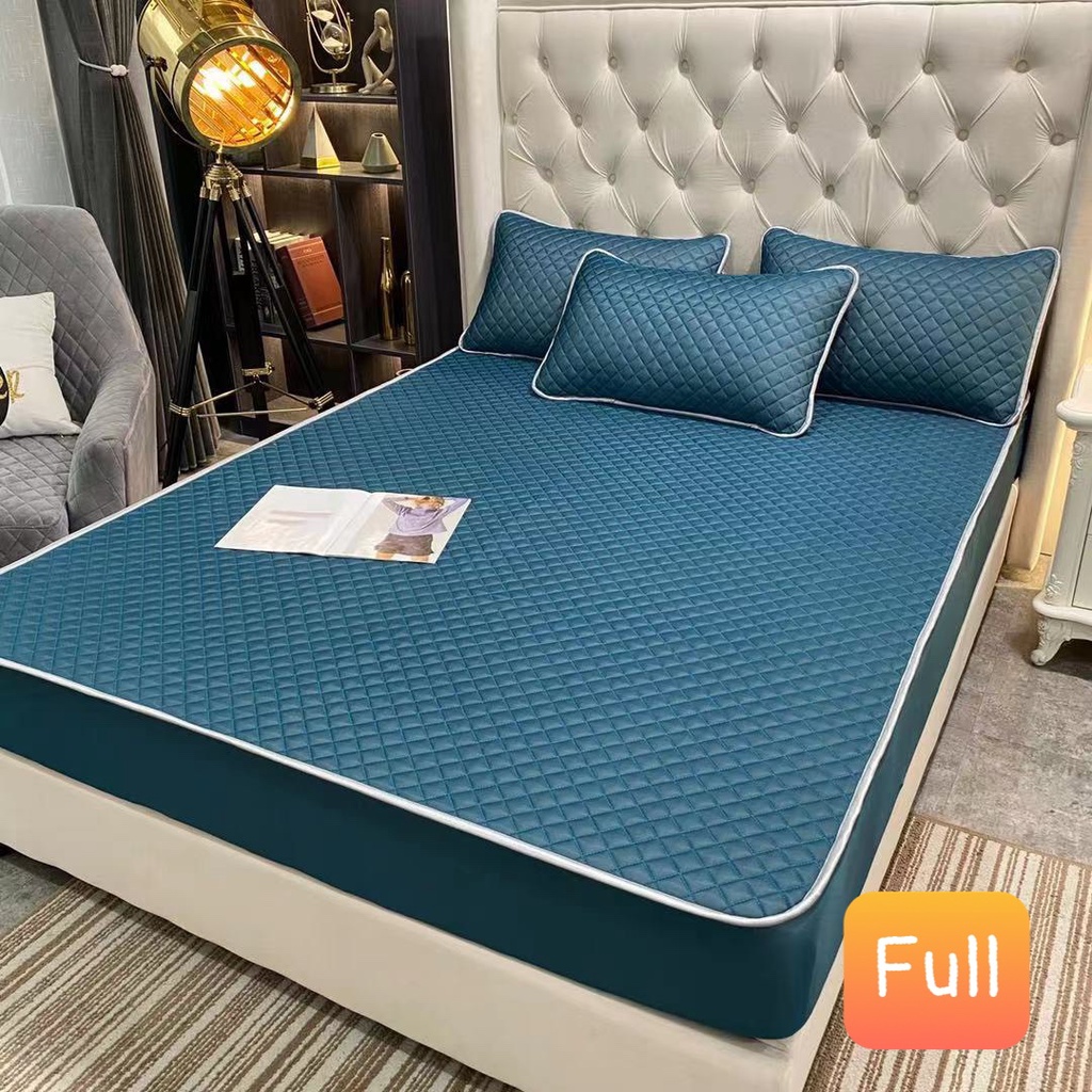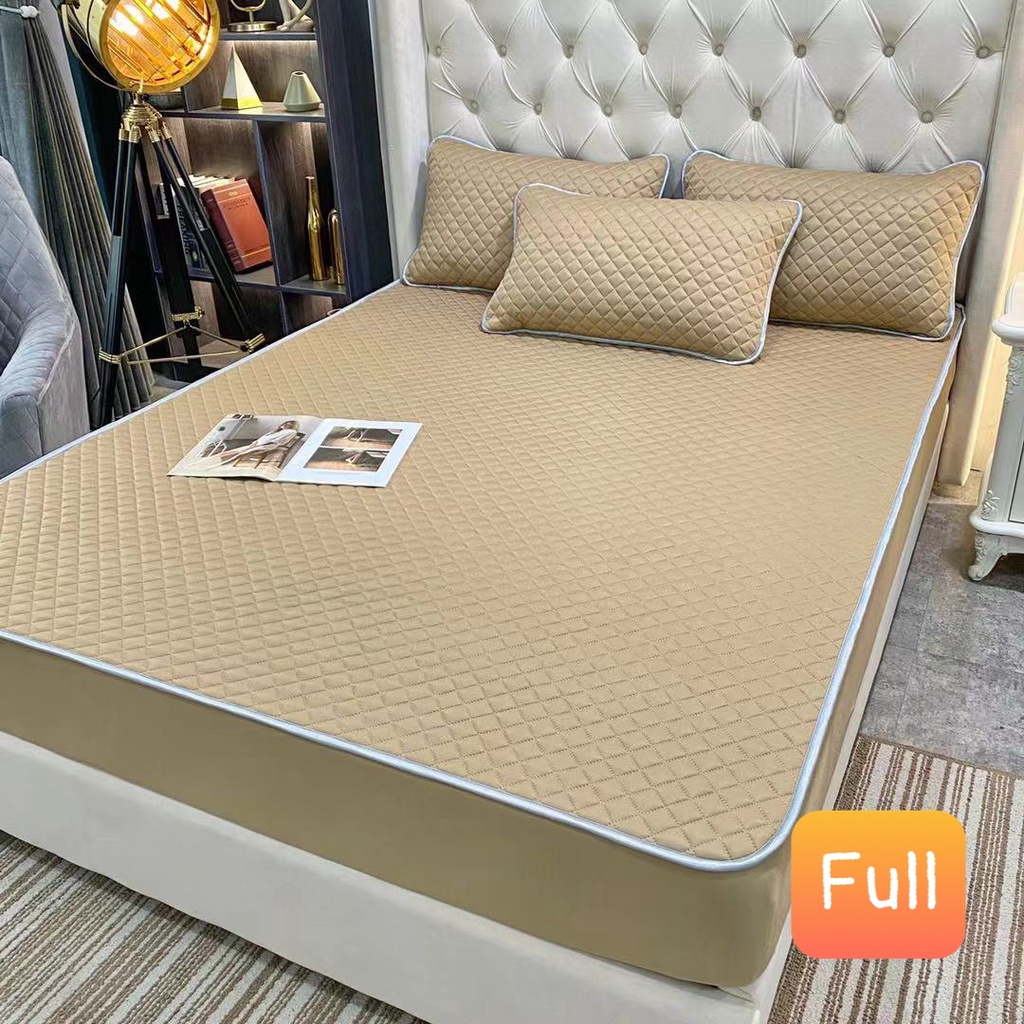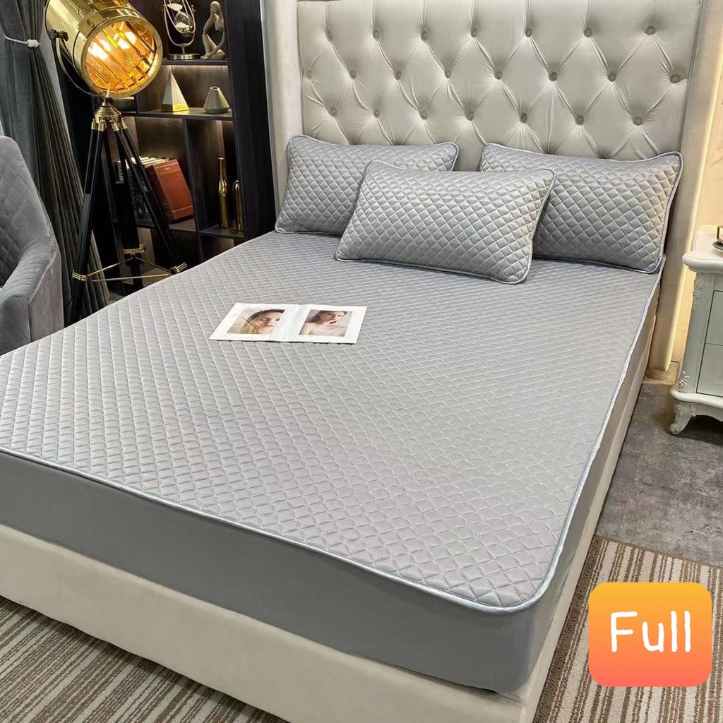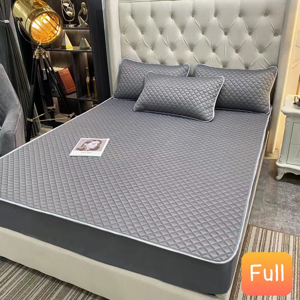 ĐỆM (như ga chun) (3 lớp :1 lớp chính đơn sắc đa dạng mẫu mã- Mặt vải THUN LẠNH cao cấp / lớp giữa Đệm lớp mút cao su tạo độ êm +đàn hồi / lớp cuối lót chống trượt + chun cài 4 góc cố định đệm) - bọc chun cho đệm tối đa đến 25cm